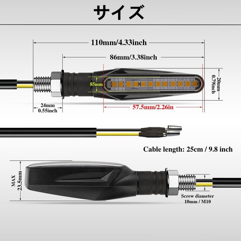 - (Turn Signal Size) Mounting bolt: M10 x 1.25 (length approx. 19 mm)); Unit size (approx.): Length 3.4 x Width 0.8 x Depth 0.9 inches (86 x 20 x 24 mm); Wire length (approx.): 9.1 inches (230 mm). Please feel free to contact us for any problems during use