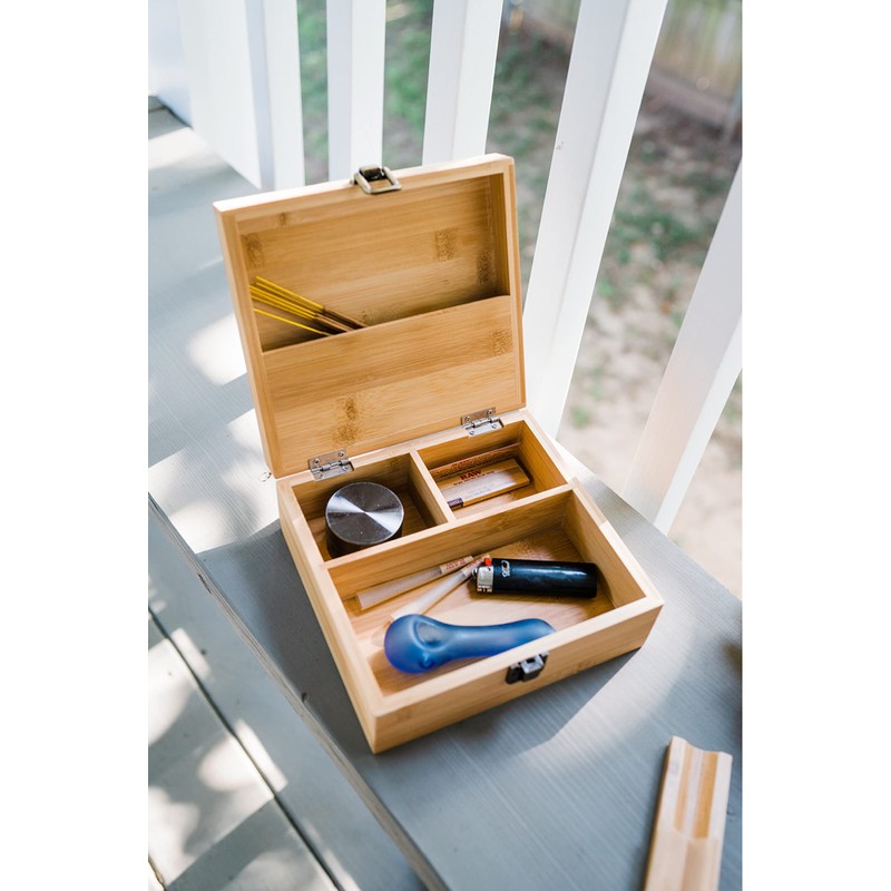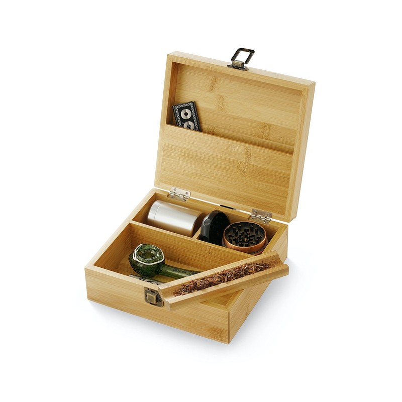 Size: Large stash box 7.5 x 7 x 3 inches made of premium bamboo including a rolling tray. This smoking kit box includes four compartments for your smoking supplies to once and for all get all your stuff in a handy place.