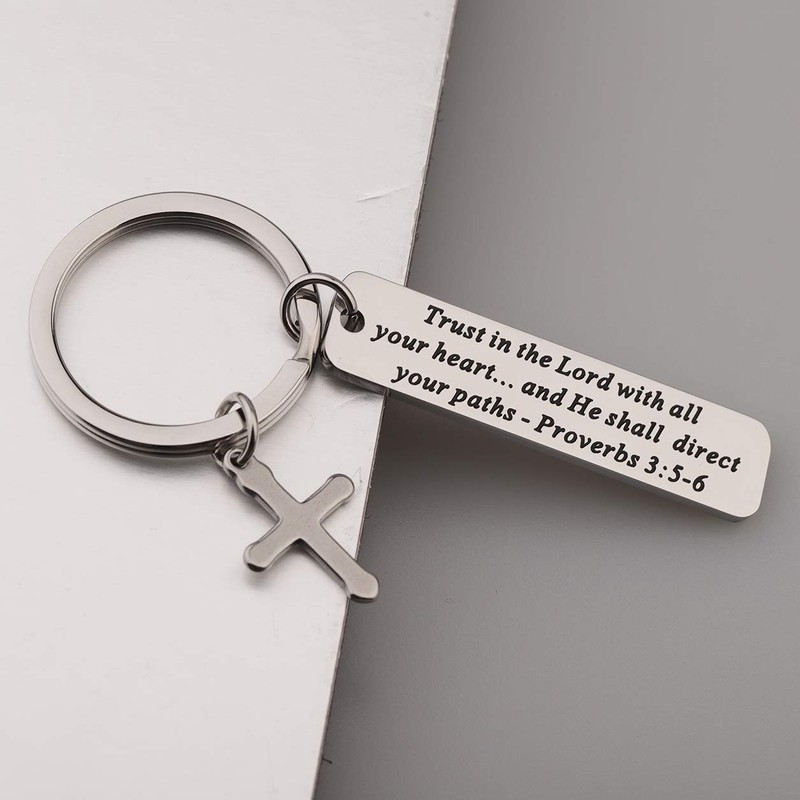 BEKECH Christian Keychain Trust in The Lord Proverbs 3:5-6 Keychain Cross Charm Religious jewelry Christian Gift (Silver)