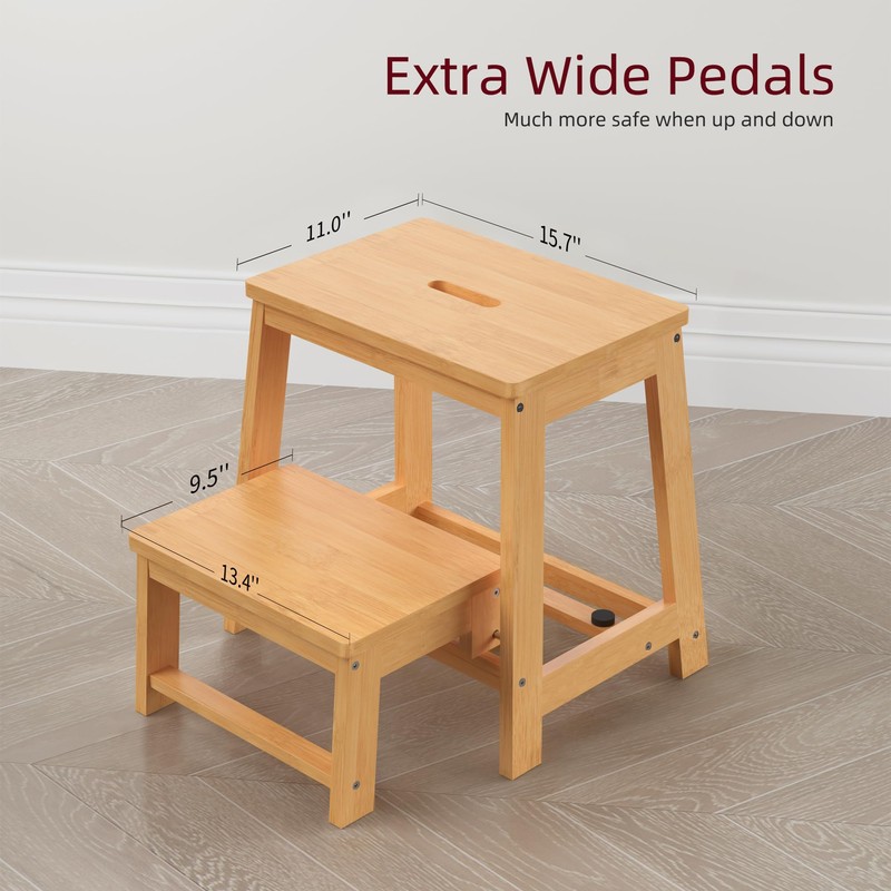 - SECURITY AND STABILITY: Wider stepping surface ensures safe standing. Sturdy structure allows the wooden step stool to safely support up to 400 pounds. It can be used for all ages, kids, adults, the elderly, pregnant women. Each foot is equipped with anti-slip pads to prevent scratches on the floor and accidental dumping. Rounded corners prevent collision injuries.