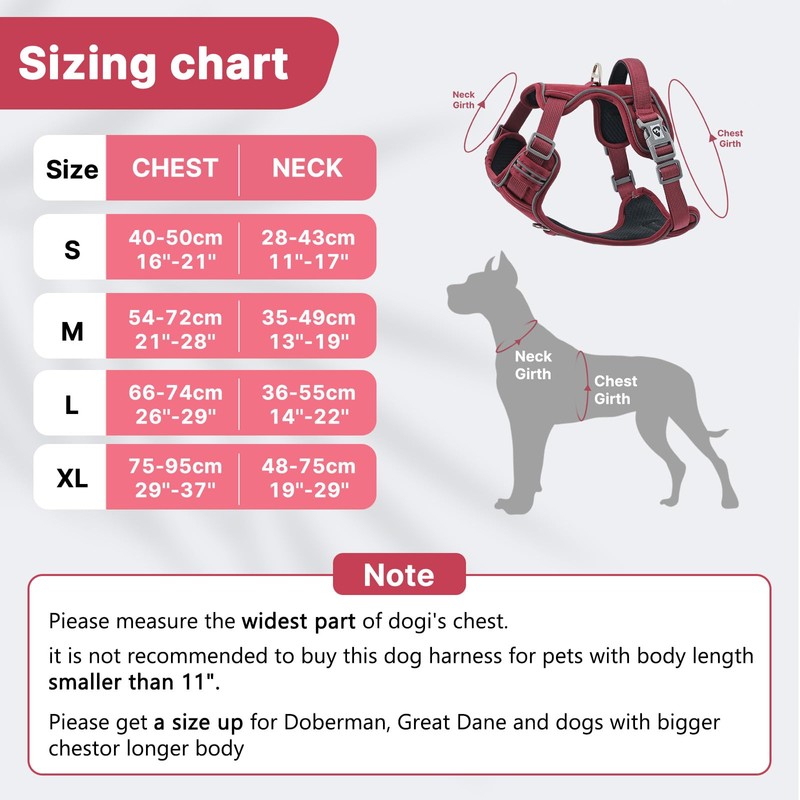 - ★【Applicable Sizes】Our dog harness comes in 4 sizes, suitable for the vast majority of dogs on the market. Size S applies to: Neck: 11"-17"(28-43cm), Chest Girth: 16"-21"(40-53cm). According to user feedback, if your dog happens to be the upper limit of this size, it is recommended that you buy a larger size chest harness, which can greatly increase the comfort of the dog.
