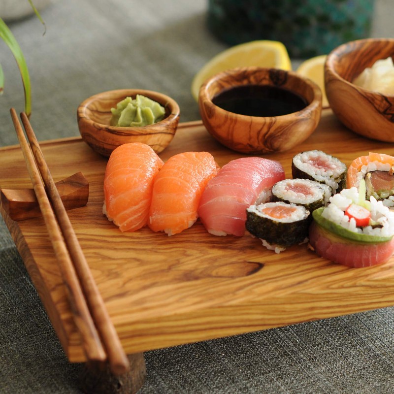 • VERSATILITY: Along with the sushi board, the set includes a pair of chopsticks and three olive wood bowls for sauces and dips, offering a complete sushi dining experience.