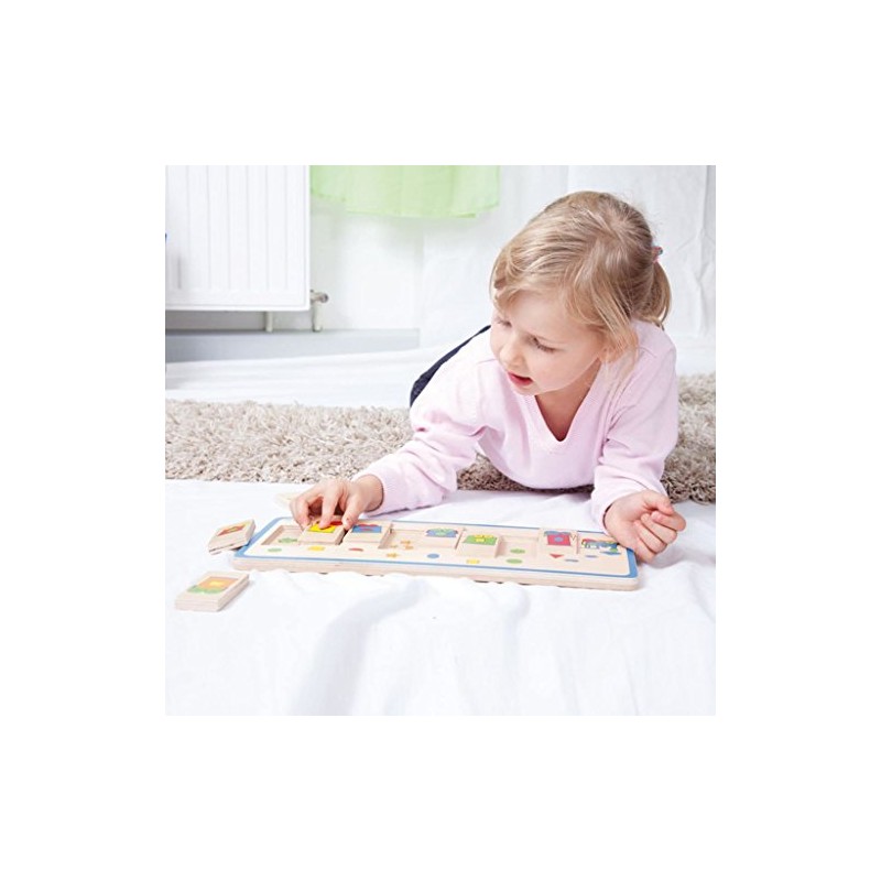 This colourful laying puzzle train by Beleduc has 8 fun windows and illustrated underneath. Thanks to the cute cartoon images and bright colors, children are playfully acquainted with different geometric shapes. In addition, this puzzle promotes colour, quantity and shape recognition. It is suitable for children from 3 years old. The package contains a total of 8 pieces.