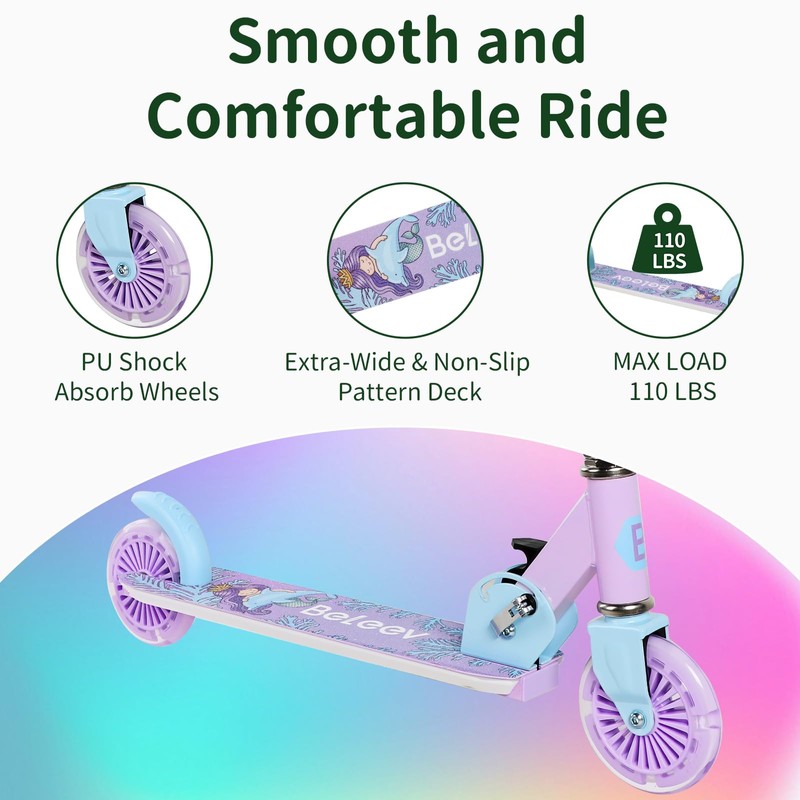 BELEEV Scooters for Kids Ages 3-12 with Light-Up Wheels & Stem & Deck, 2 Wheel Folding Scooter for Girls Boys, 3 Adjustable Height, Non-Slip Pattern Deck, Kick Scooter for Children (Purple)