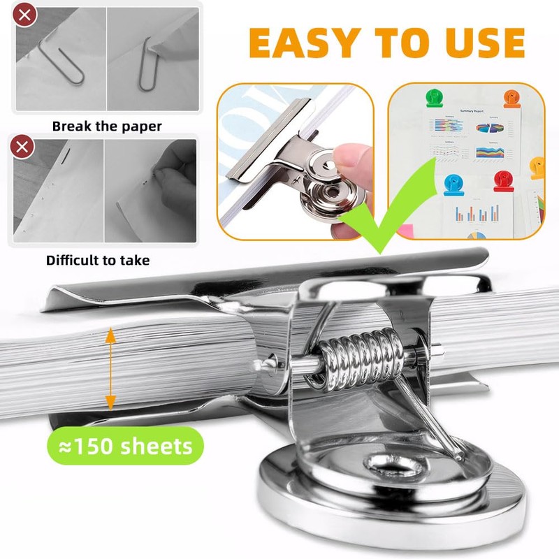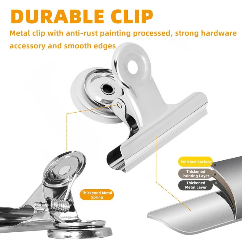 - Durable and Round Edge - Rigorously tested for long-lasting performance. The sturdy spring allow thousands of time to open and clip. Smooth edge won't break the papers and scratch refrigerator or whtieboard surfaces.
