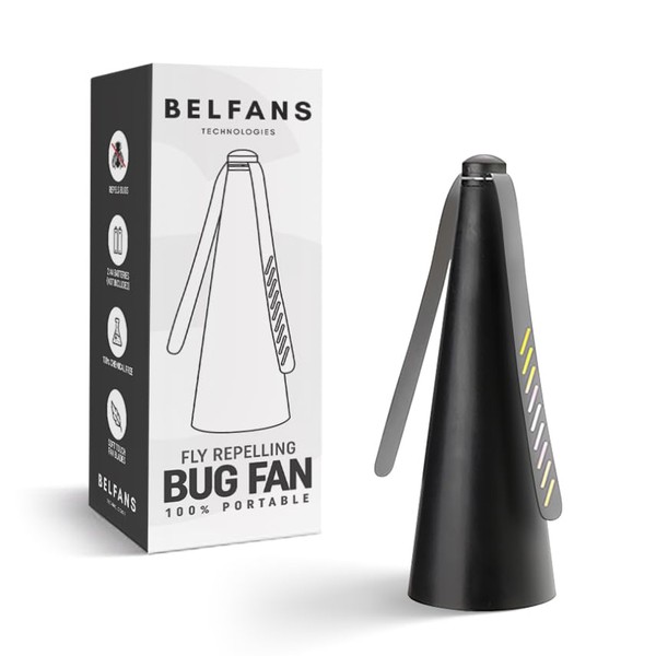 Belfans FlyRepellent Fan for Tables – USB Powered/AA Battery Powered, Soundless Fly Swatter with Holographic Blades – Portable Fly Fan for Bees, Wasps & Outdoor Use (1, Black)