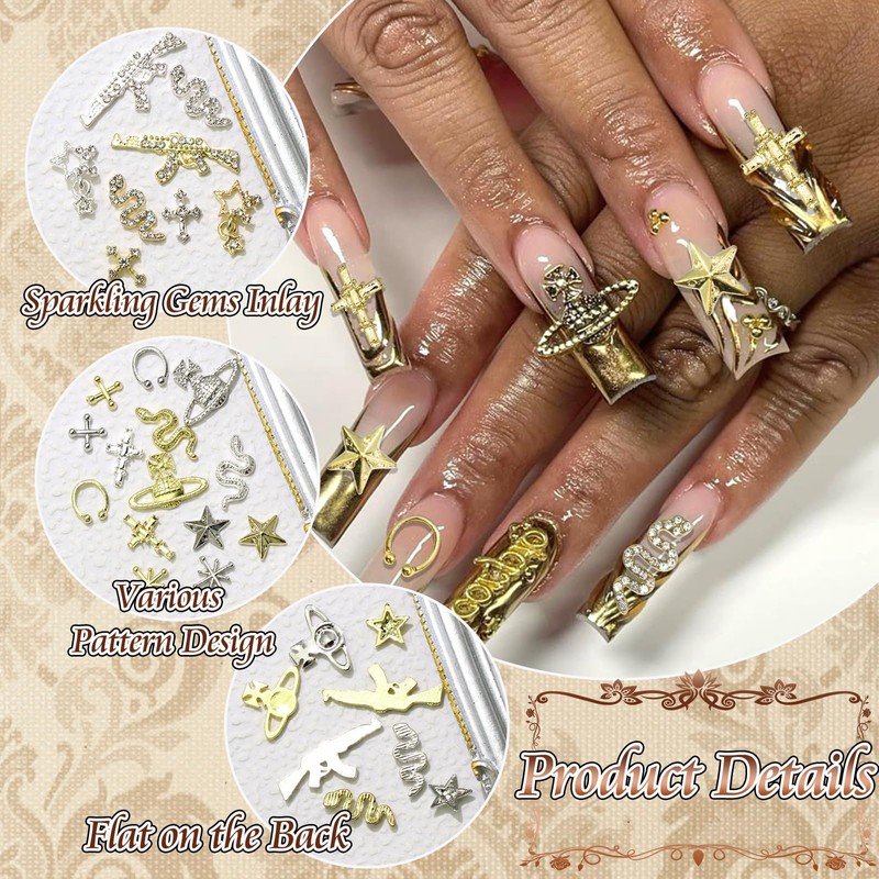 - What You Will Receive: You will receive a package of mix gold silver nail charms. Built-in various sizes and shapes (star/cross/planet/gun/snake/rivet, etc.), can meets your daily needs. Some of the nail charms also have shiny gems inlay. These Assorted Nail Charms are about 24 styles, 186pcs in total, for a large qunatity and variety, which can help you design any kinds of nail styles you want!