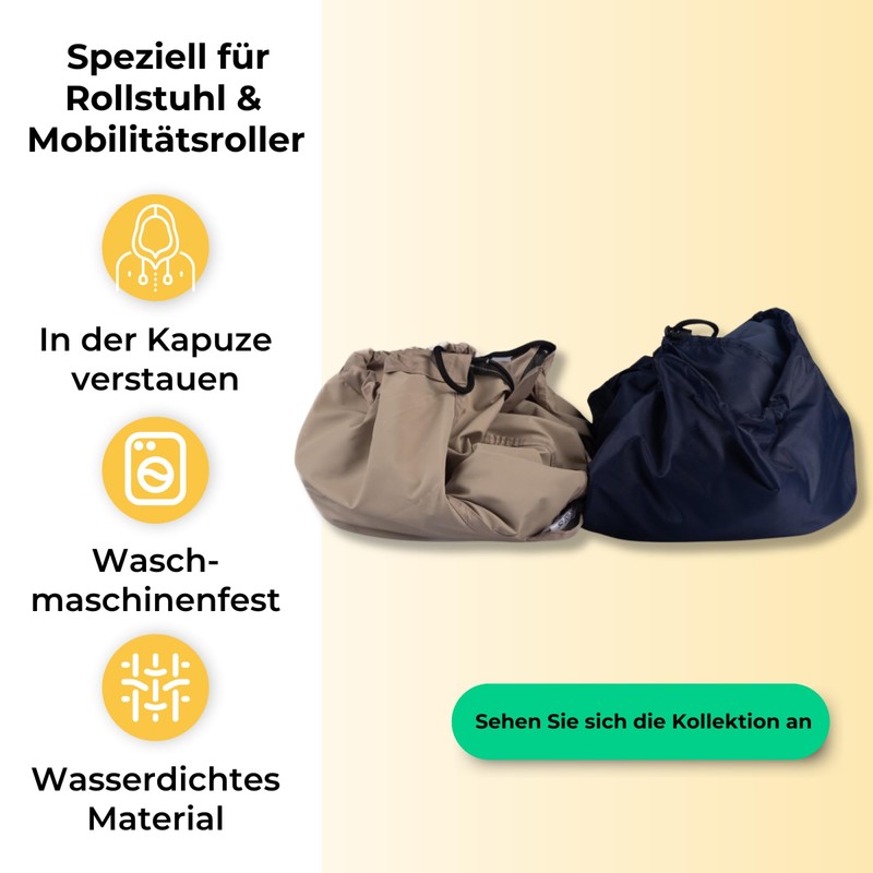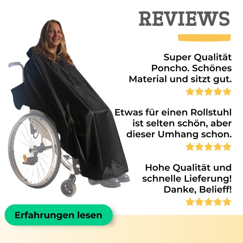 - Comfortable in all weather conditions – with hood and extended back, this rain poncho for wheelchairs protects even in heavy rain. The perfect rain cover wheelchair for anyone who wants to stay mobile even in bad weather.