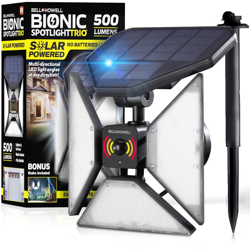 - Bionic Spotlight Trio: Protect your property with the easy-to-install Bionic Spotlight Trio. The Spotlight is 100% solar powered, with no wiring needed, and designed to be installed in under 5 minutes, saving you time and money. The built-in motion-activated sensor deters thieves and animals from your property, and the 3-panel light ensures wide light coverage for maximum efficiency.