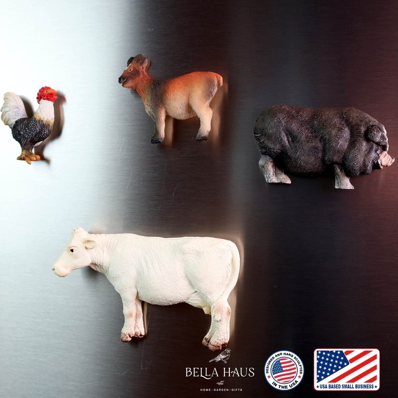 - Highly realistic kitchen decor: Beautiful farm animal decor handcrafted in intricate detail. This stackable refrigerator magnet set consists of a cow, pig, goat and rooster. Sculpted in 3D with a textured surface, these animals are highly realistic.