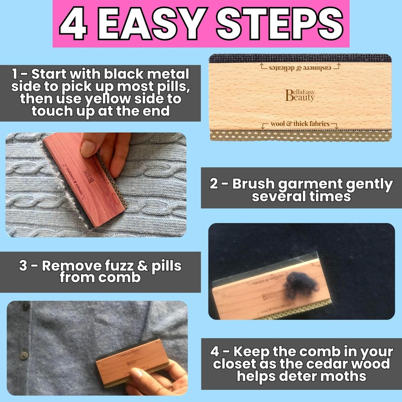 bellaeasybeauty Cashmere Comb for De-Pilling Sweaters - Remove Pills, Lint, and Fuzz from Wool Garments - Dual-Sided Fabric Comb with Cedar Wood Handle