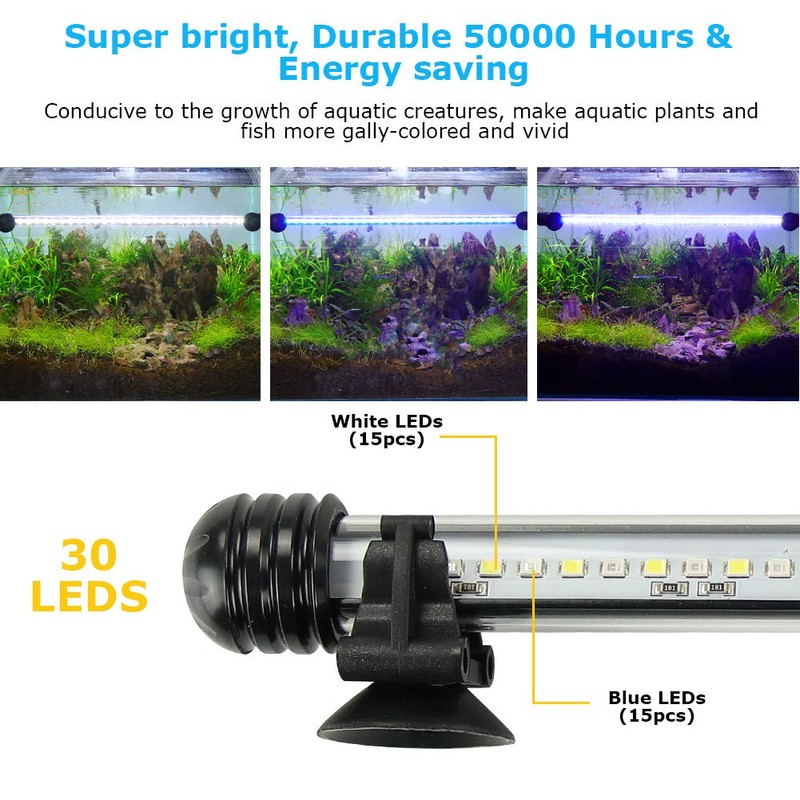 • 2 light effect modes: blue, blue and white; SMD 2835 LED, 12 white LEDs and 3 blue LEDs ensure the natural look of your aquarium, making the fish and plants appear bright and attractive