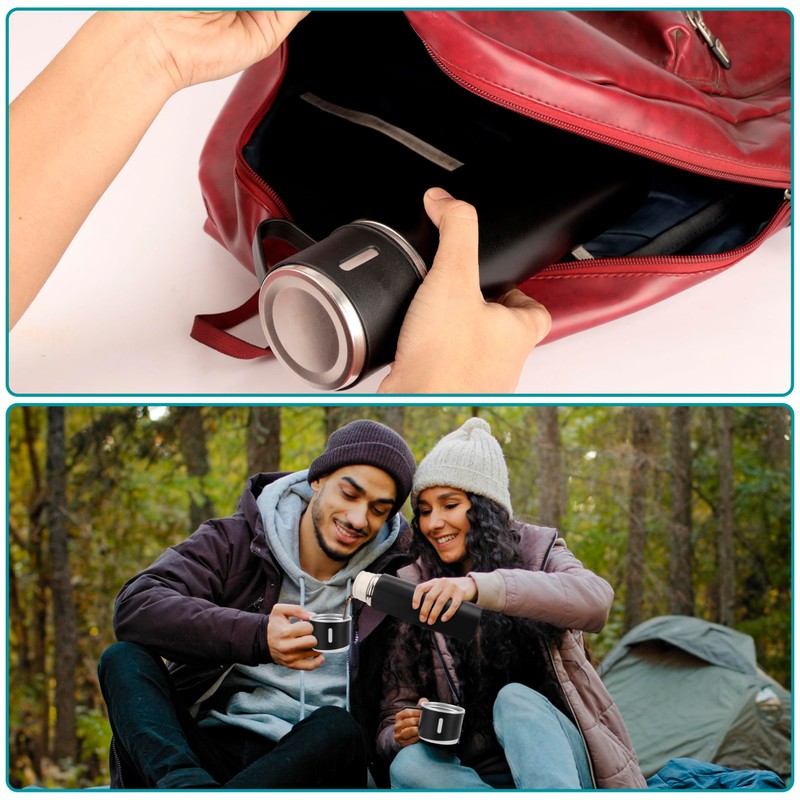 Belle Vous Black Stainless Steel Thermos Flask with Lid and 2 Cups - 500 ml Double-Walled Thermos Flask with Cup - Leak-proof Thermos Bottle for Hot and Cold Drinks