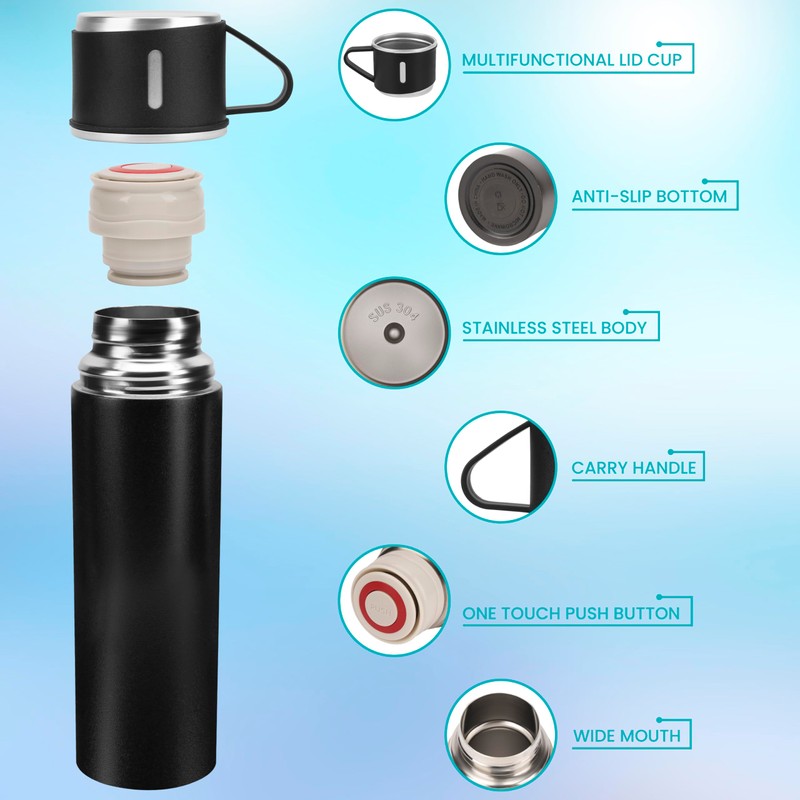 - 1 x black vacuum flask made of stainless steel with cup lid.
