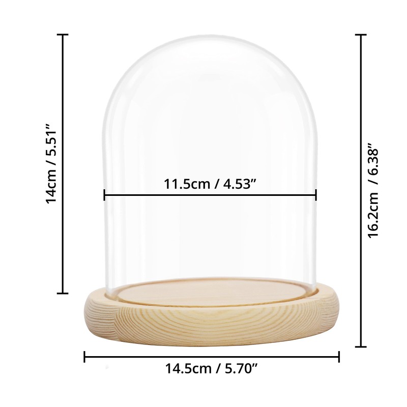 - DECORATIVE GLASS CLOCHE: Our glass dome display case is 16.2cm (6.38 inches) in height (including the base) and has a total base diameter of 14.5cm (5.70 inches). The inside diameter of the glass is 11.5cm (4.53 inches). The total height of the glass (not including the base) is 14cm (5.51 inches). The wood base is a natural beige colour and is unfinished.