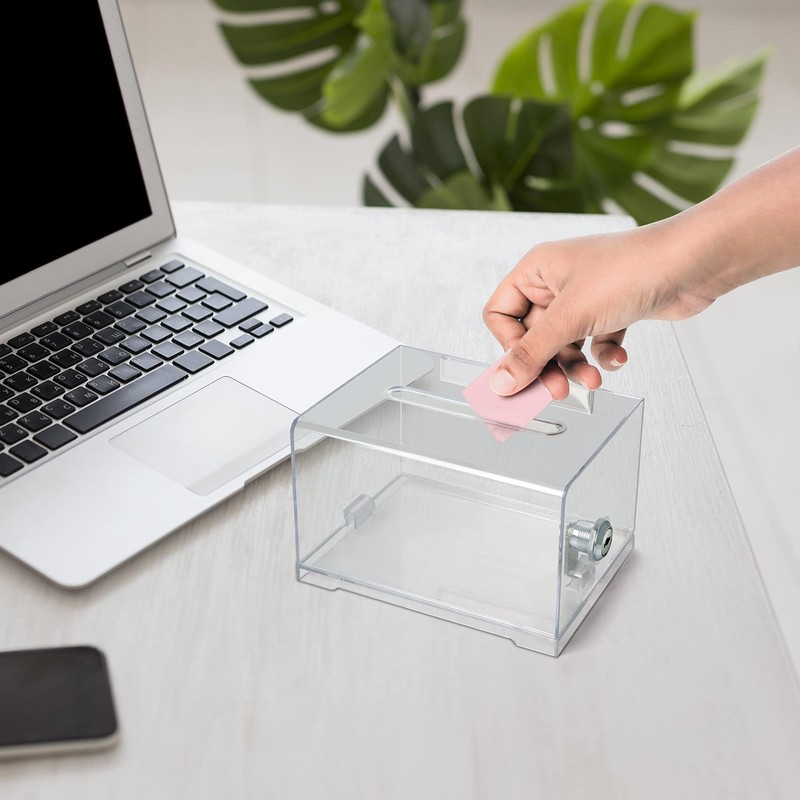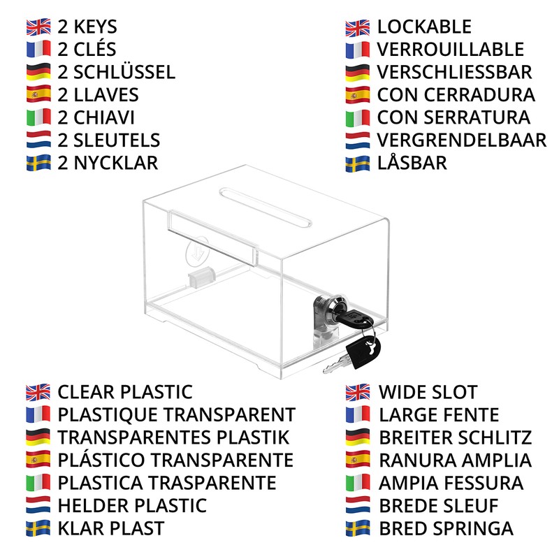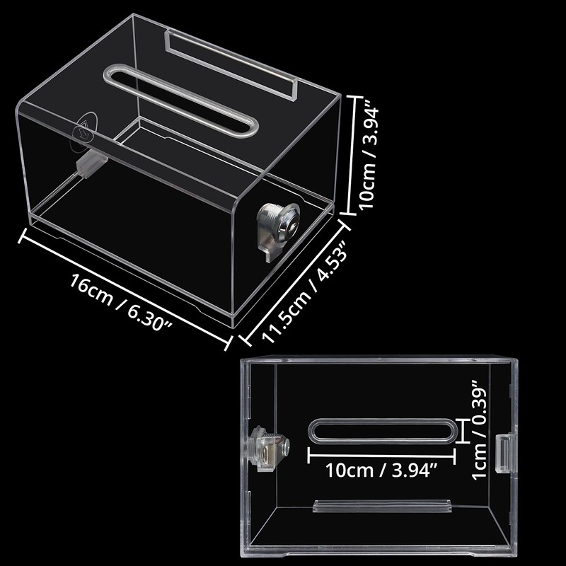 - Versatile: this lockable box with lock can be used as a transparent money box, as a cash box with slot or as a lot box. Place the cans at carnival, fairs, festivals, churches, in a shop on a shop counter or a reception counter. Collect suggestions, business cards, name cards, sweepstakes cards, participation forms, survey collections, entrance tickets, ballots, service tips, fundraising fundraising fundraisers, keys and much more.