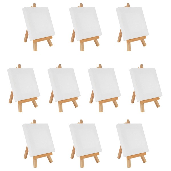 Belle Vous Table Easel Wooden Canvas Stand Set (10 Pieces) - 10 x 10 cm Canvas with Mini Easel, Wooden Easel - Canvas Covered Primed - Canvas Painting for Oil/Watercolours, Drawing, Children