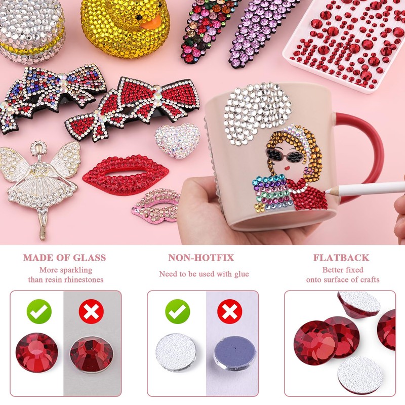 - WIDE APPLICATION -- The iridescent and bedazzling gems will remarkably add glitz to your DIY crafts, like shoes, sneakers, high heels, tumblers, mugs, goblets, bottles, clothes, dresses, jeans, hats, masks, glasses, phone cases, popsockets, scrapbooks, diamond paintings, greeting cards, bags, guitars, keychains, hair clips, etc. You can use them for face makeup, eye makeup, body art, 3D nail art as well. Apply it to whatever you want to bedazzle!