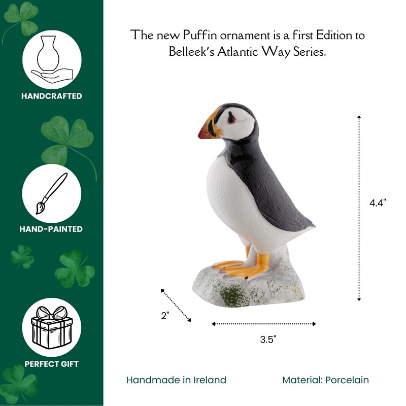 - WILDLIFE INSPIRED: The Belleek Puffin Ornament (3.5”L x 2”W x 4.4”H) captures the beauty of Ireland’s coastal seabirds, found along Rathlin, Tory, and Puffin Islands. Featuring intricate detailing and vibrant colors, this animal statue celebrates Irish nature and conservation. Ideal as shelf decor, it brings a touch of the Atlantic coast to any space