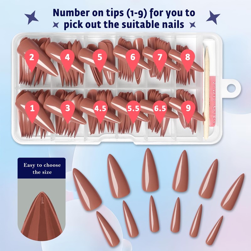 - Stiletto press on nails long kit: come with 120pcs stiletto caramel nails press on long for women girls teens diy long false nails. 1*strong nail glue for get long lasting artificial caramel stiletto nail, 5 nail adhesive tabs. 1 nail file and 1 wooden stick. No need to buy additional materials, you can achieve the long nail salon effect at home in minutes. Providing you with two ways to press on nail. Save your money and time