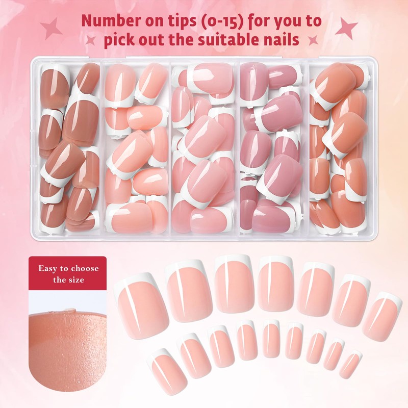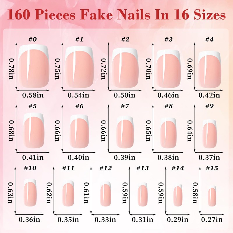 - 【French Tip Nails Kit】Press on nails french tip design comes with 150 pieces of medium square fake nails.These french press on nails are the easiest way to achieve a salon look without spending money or time on a visit