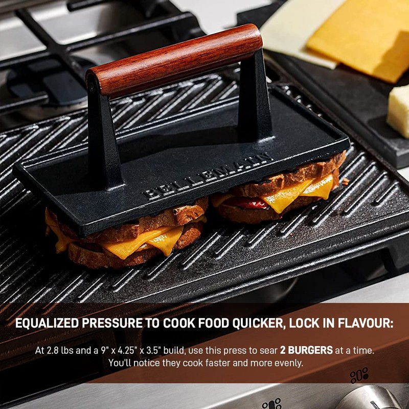- GRILLED CHEESE AND PANINI MASTERSINTRODUCING BELLEMAIN'S FOOD-GRADE PREMIUM GRILL PRESS: Bring the sandwich expert out in anyone with our exclusive heavy-duty PTFE/PFOA-free cast iron grill press . Ideal for sealing in flavour with stylish sear marks . Your sandwiches will never be the same .