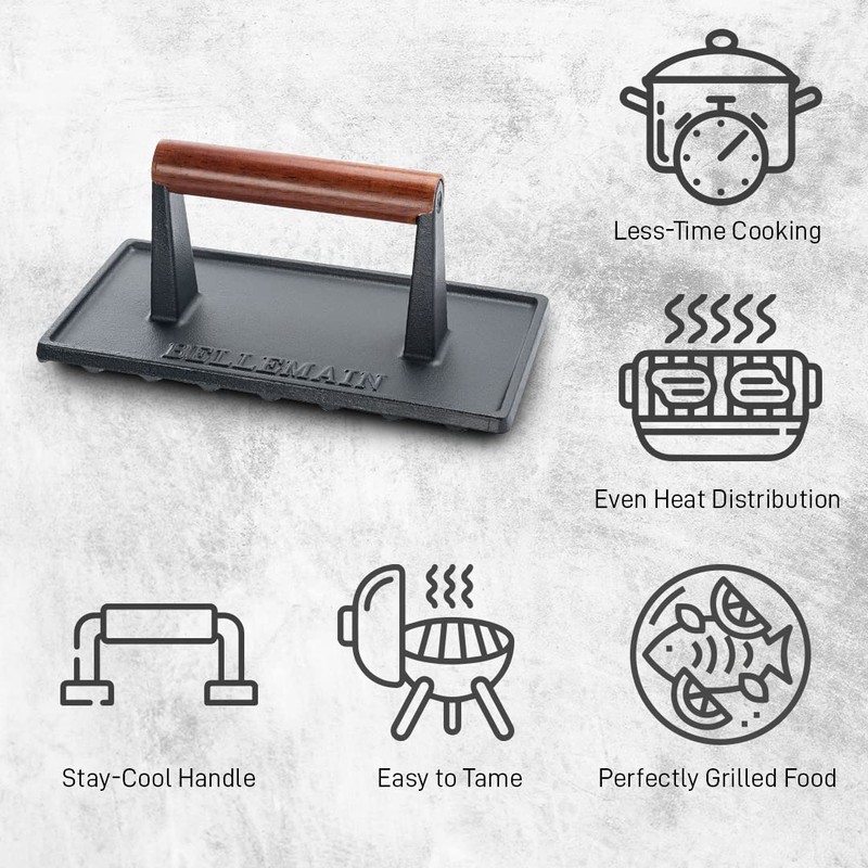 - SMOOTH WOOD HANDLE | EASY , VERSATILE , AND EYE CATCHING: Watch smiles grow . Everyone enjoys the sound of sizzling that comes with searing their meal to perfection under a hot cast iron press . With its ergonomic , classically designed wood handle , your meals will be evenly pressed to perfection