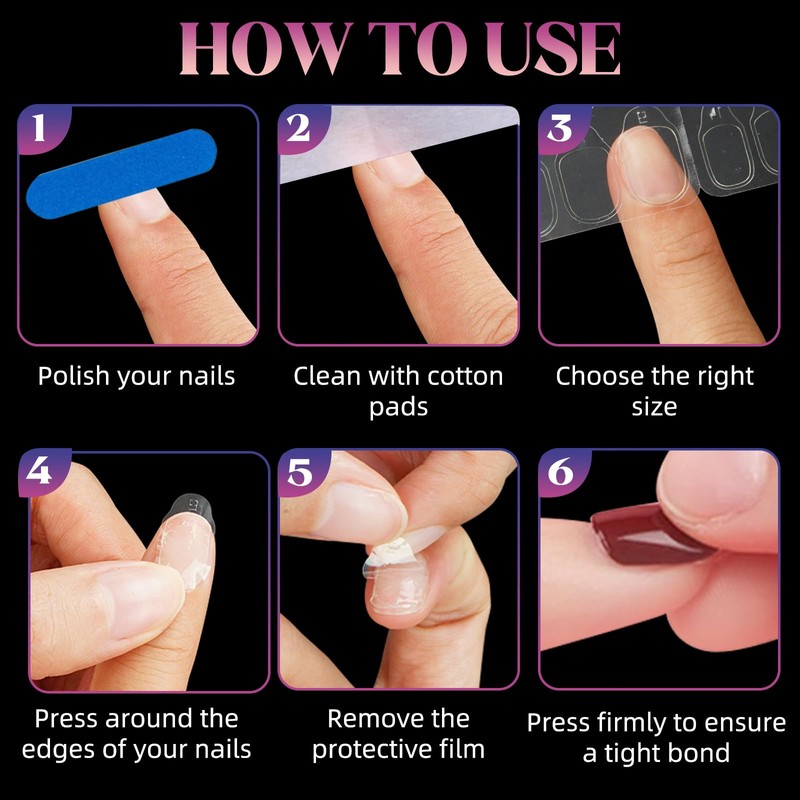 - Custom Fit for Every Nail: Each sheet contains 15 different sizes of sticky tabs, ensuring a perfect fit for any nail shape. The ultra-thin, transparent double-sided nail sticker make your press on nails look more natural while providing a stronger, longer-lasting hold