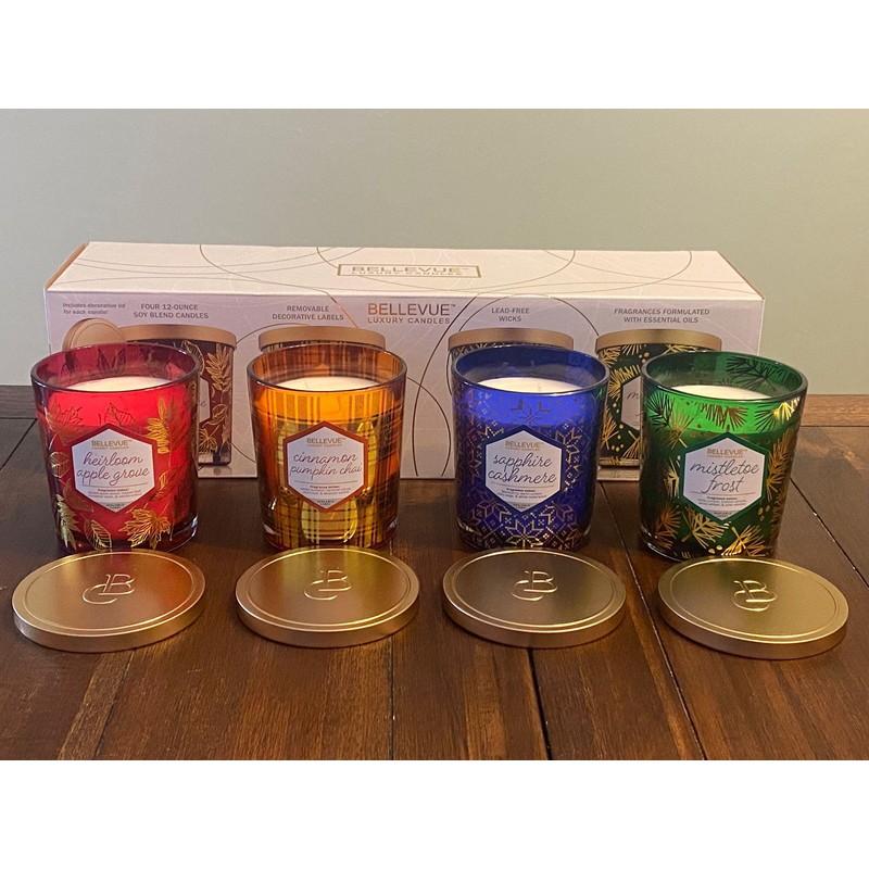 Bellevue Luxury Candles, 4 Soy Blend Candles 12 oz Each, Removable Labels, Lead-Free Wicks, Fragrances with Essential Oils
