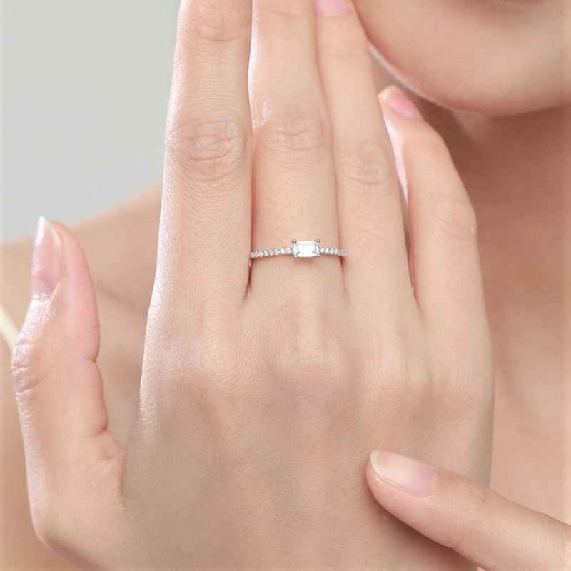 - Parameter: women engagement ring with gemstone, emerald cut, ring head: 5mm x 3mm, ring weight: 1g. The material: 5a cubic zirconia, plated 925 sterling silver. Other gifts: pamphlet, flannel bag, jewelry cleaning cloth.
