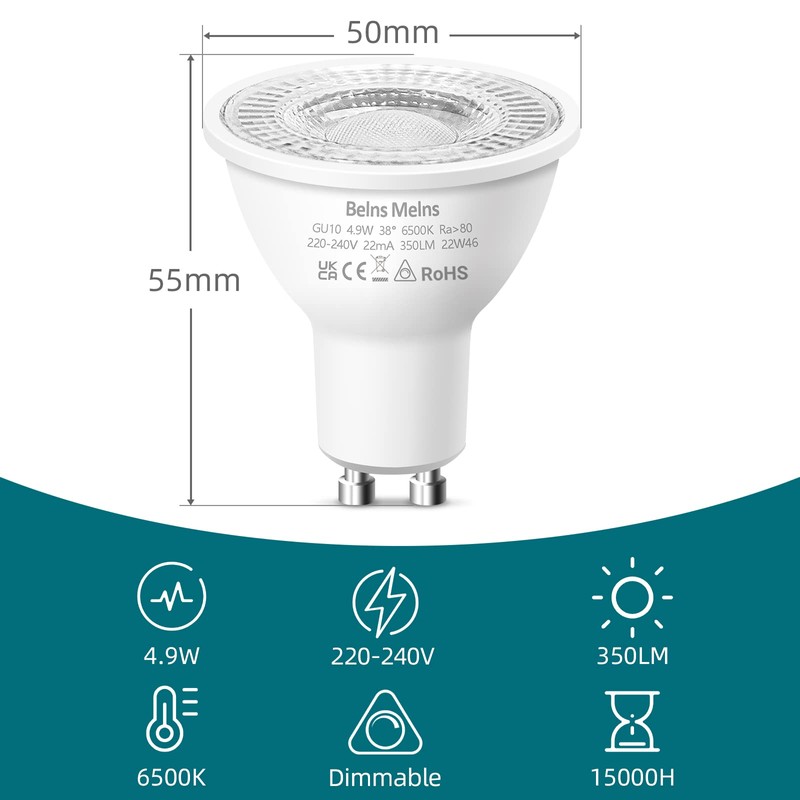 Belns Melns GU10 LED Bulbs Dimmable, Cool White 6500K, 50W Halogen Spotlight Equivalent, 4.9W LED GU10 Bulbs Dimmable, 220-240V 38 Beam Angle Energy Saving - Pack of 10