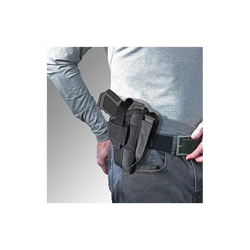 - Spare magazine pouch on the front of the holster. Please note this holster is primarily designed for open carry.