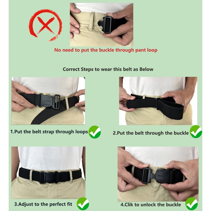 - Heavy duty quick release metal buckle: the nylon belt comes with quick release buckle, which is locked by "plugging in" like a seat belt buckle, while the release is done by clicking. It allows you to lock or unlock the belt within seconds