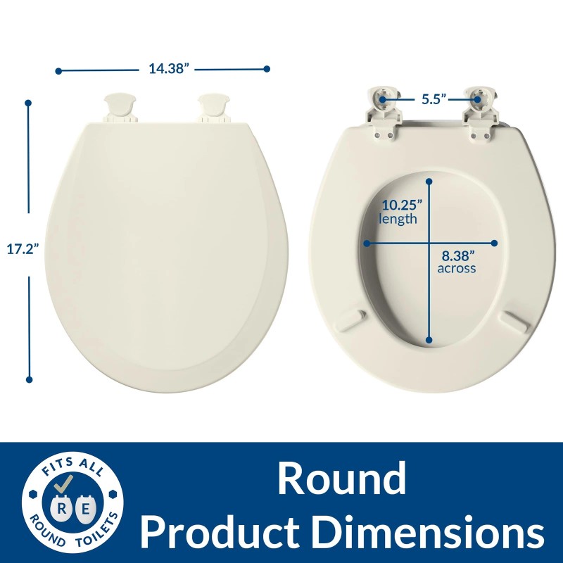 - COMPATIBLE WITH ALL ROUND TOILETS: You can feel confident this seat measuring 14.38” wide x 17.2” long will fit all standard round toilet brands and models; watch our video above to learn how to measure your toilet before selecting a size