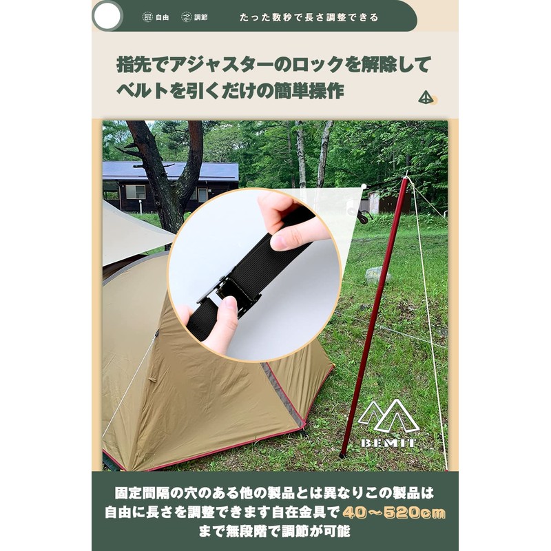 - Adjustable Length in Just Seconds: Simply unlock the adjuster with your fingertips and pull the belt. Unlike other products with fixed spacing holes, this product can be freely adjusted to the length of the product, and it can be adjusted steplessly from 15.7 to 20.5 inches (40 to 520 cm) with the flexible bracket. From solo to large tents can be layed out freely