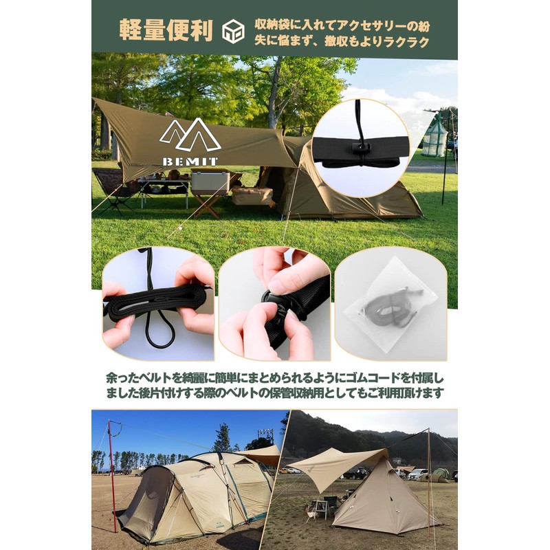 - [Stream Setting Tape] Convenient setting tape for setting up tarp. It is a form of tightening that connects the tent to the tarp. Before the tent, you can connect the tarp, so you can have a shelter from the sun and rain