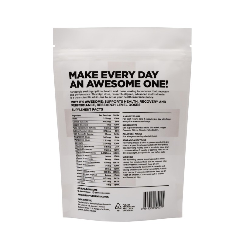 Product descriptionFor people seeking optimal health and those looking to improve their recovery and performance. This high dose, research aligned, advanced multi-vitamin is a truly scientific all-in-one designed to support busy lifestyles and act as your health insurance policy. High in vitamin D, magnesium, zinc, iron, B12 and more, you'll struggle to find anything that compares to the breadth and dosing of our formula. Product is 120 capsules, giving you 30 servings if taking the recommended 4 capsules.IngredientsBiotin, Calcium, Copper, Folic Acid, Iodine, Iron, Magnesium, Manganese, Selenium, Vitamin A, Vitamin B1, Vitamin B12, Vitamin B2, Vitamin B3, Vitamin B5, Vitamin B6, Vitamin C, Vitamin D3, Vitamin E, Vitamin K1, Vitamin K2, Zinc
