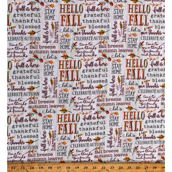 Cotton Hello Fall Words Whitewash Autumn Thanksgiving Cotton Fabric Print by the Yard (13011-75)