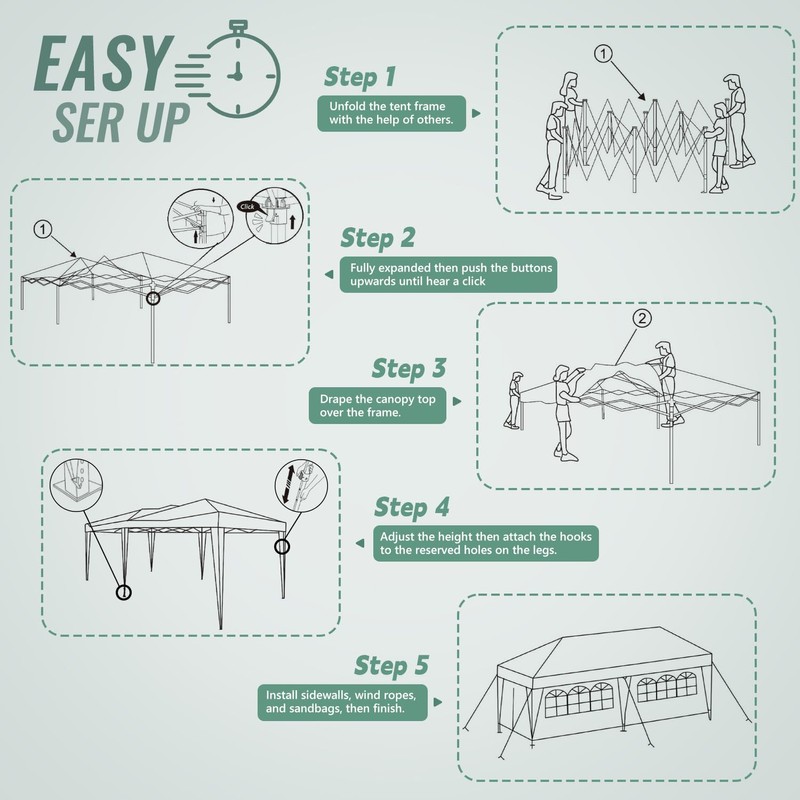 • Easy to Setup - Stretch the frame, cover the top cloth then push the buttons on each legs upward until you hear a click. Adjust the height and fix the base, then assemble sandbags and wind ropes. It's as simple as that