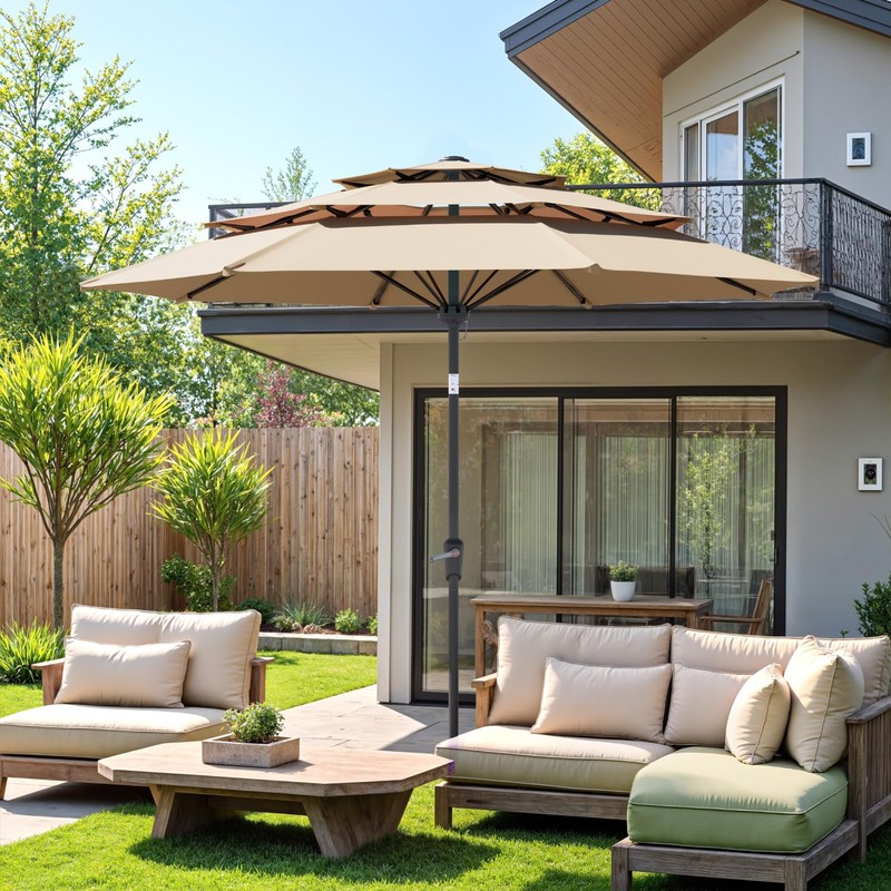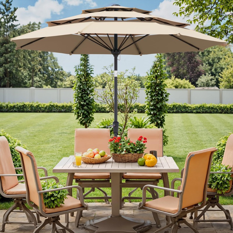 Benass 9ft Outdoor Patio Umbrella, 3 Tier Vented Table Umbrella with Push Button Tilt and Crank, 8 Fiberglass Ribs Market Umbrella (Beige)