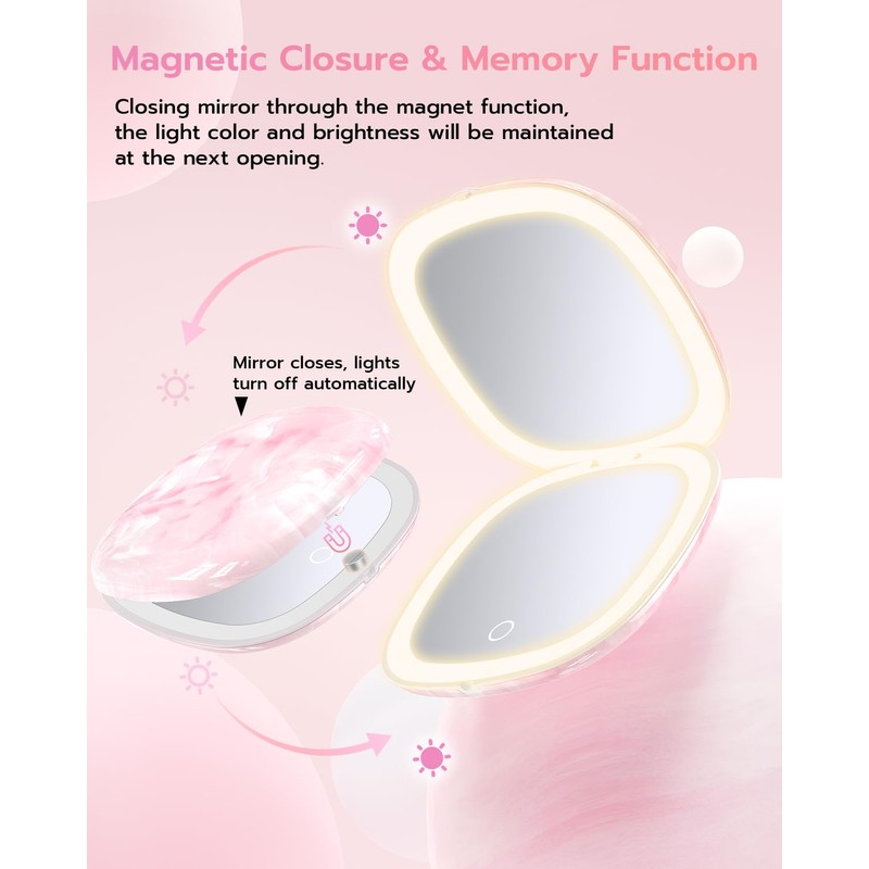 • Cierre magnético y función de memoria: el espejo de maquillaje mini bolso está diseñado con cierre magnético, lo que hace que el espejo sea fácil de abrir y cerrar y no daña fácilmente tus uñas. Además, nuestro espejo de maquillaje también tiene una función de memoria de color claro y brillo, cuando cierras el espejo y luego lo abres de nuevo, conservará el color y el brillo de la última vez que utilizas la luz.