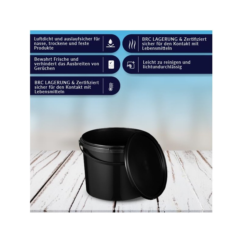 - Airtight – the waterproof plastic bucket with handle is extremely versatile and is perfect for storing liquids (hot and cold), powders, granules and solid products as well as for transporting without spills. Whether in the kitchen, shed, at work, in the workshop or in the garage - this bucket is the ideal companion. Thanks to its black colour, it stands out less. It also has no labels or stickers.
