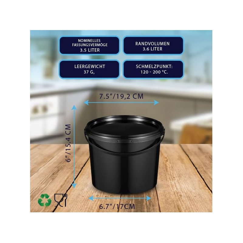 - Details: Dimensions of the 3L bucket: height with lid: 15.4 cm, base diameter 17 cm, lid diameter: 19.2 cm, nominal capacity: 3.5 litres, capacity to rim: 3.6 L, empty weight 120 g (bucket with lid) melting point: 120 - 200 degrees Celsius