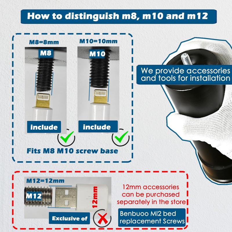 - Different adjustable bed frames have various bolt threads, 70% of customers don't know the size of their bed leg screws, so we provide 8mm and 10mm common screws for 93% of the bed frames, and you can change them to fit different brands of bed frames, if you need 12mm you can find it in the store search to buy: Benbuoo M12 Bed Replacement Screws