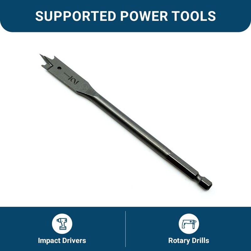 - The bits with quick-change hex shank can be used with electric powered rotary drills and impact drivers for added torque. Our spade bits are designed with a cavity and fisheye hole making the removal of debris and plugs a breeze.