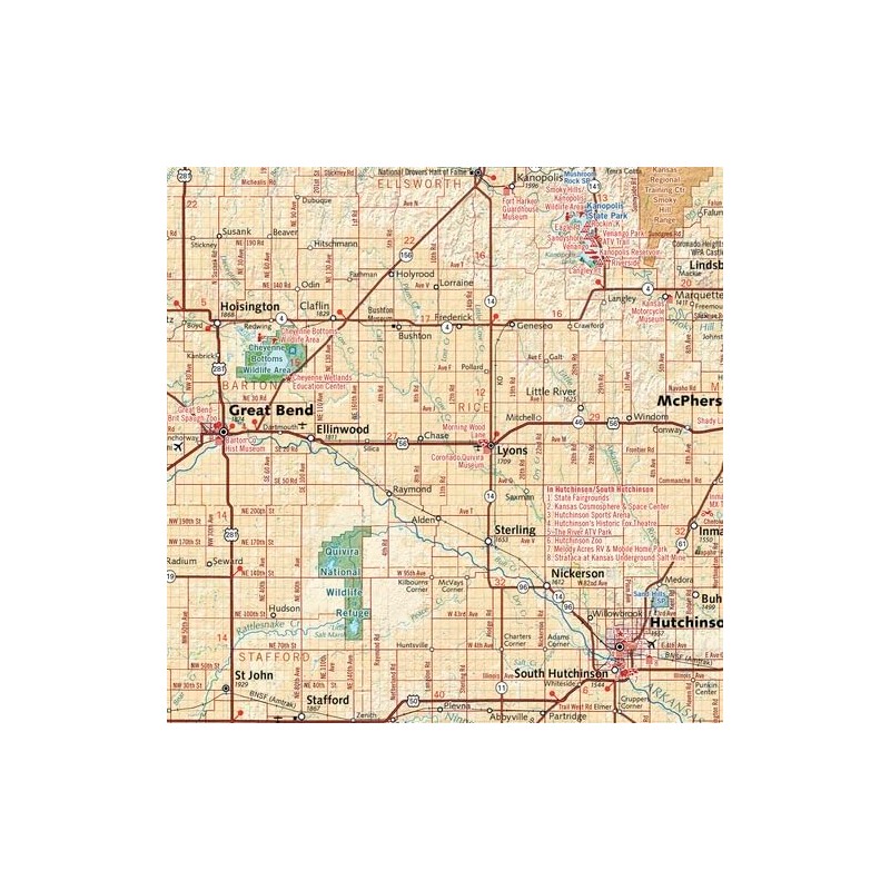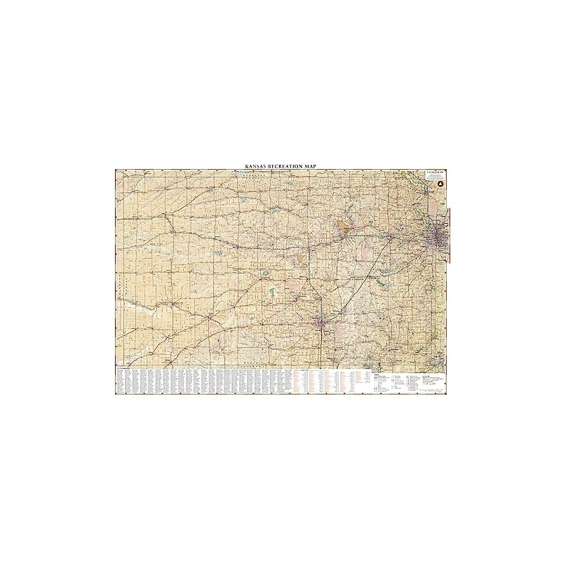 This wall map beautifully illustrates the country roads that crisscross The Sunflower State, and the recreation opportunities that exist throughout.