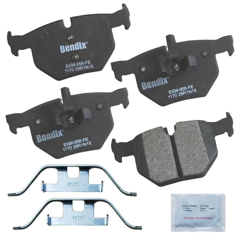 Bendix Priority 1 Semi-Metallic Brake Pads Set with Installation Hardware. These brake pads are engineered and designed to meet all OE specifications for fit, form, and function while providing safe, consistent, and reliable stopping performance. With specific shims, slots, and chamfers, the pads provide not only a precise fit but also an ultra-quiet braking experience.