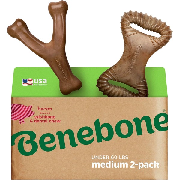 Benebone 2-pack Wishbone/Dental Durable Dog Chew Toys, Dog Toys for Aggressive Chewers, Real Bacon, Made in USA, Medium