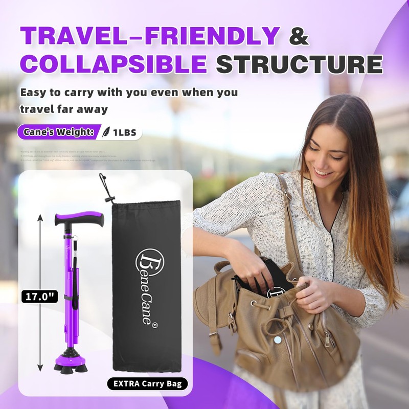 BeneCane Walking Cane for Men & Women Walking Stick for Seniors Folding Canes Quad Cane Adjustable Lightweight Sturdy Collapsible Heavy Duty with Soft TPR T-Handle and Travel Bag