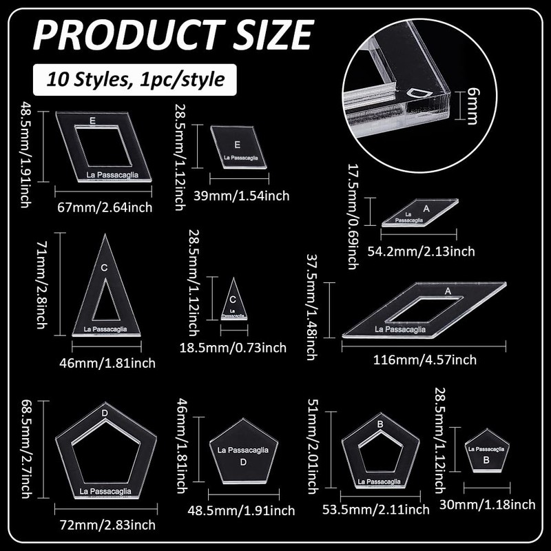 - 10 Sizes: Stencil set includes 10 sizes, A~E 5 series, 2pcs for each series, Triangle, Rhombus, Pentagon. Detailed information please refer to the picture